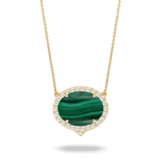 Magnificent cuts of malachite are set in 18 kt yellow gold with sparkling white diamonds.